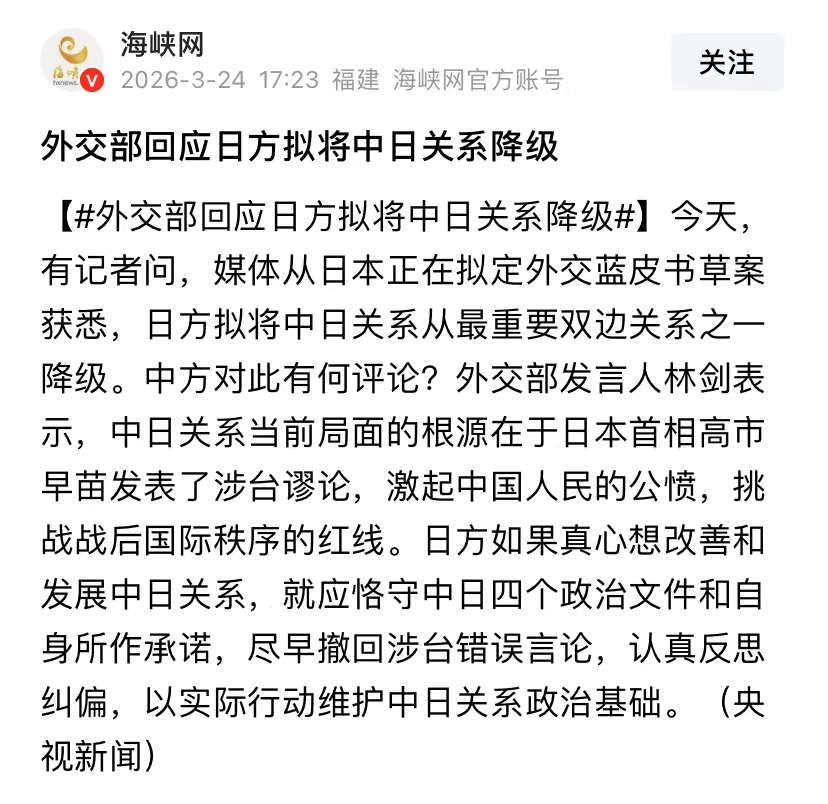 3月24日,媒体从日本正在拟定外交蓝皮书草案获悉,日方拟将中日关系从“最重要的双边关系之一”降级为“重要邻国”,并强调“战略性”和“互利性”。